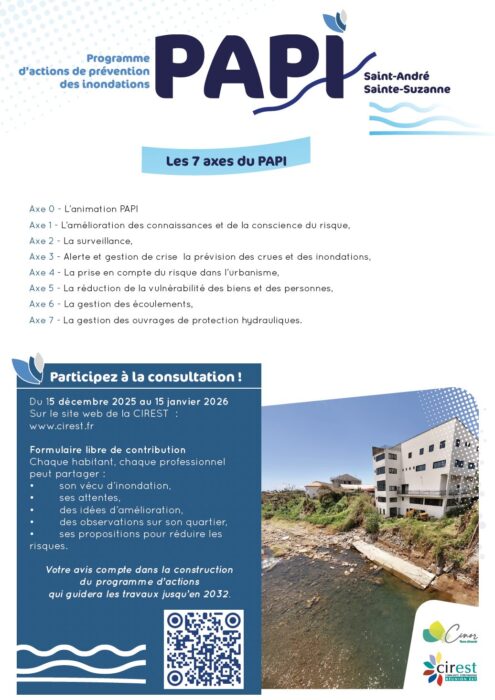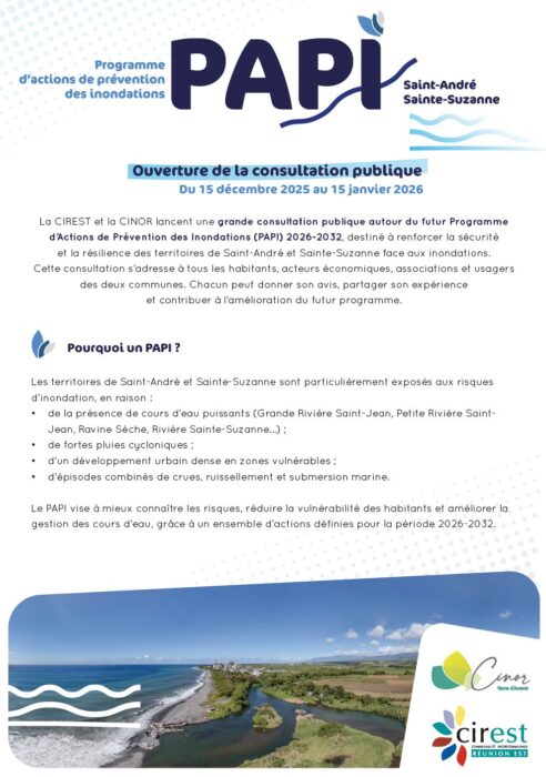 La CINOR et la CIREST lancent une consultation publique du 15 décembre 2025 au 15 janvier 2026 autour du Programme d’Actions de Prévention des Inondations (PAPI).